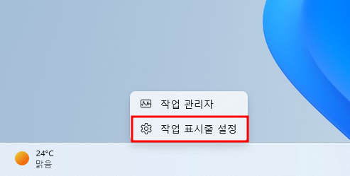 1. 작업 표시줄의 빈 공간을 마우스 오른쪽 버튼으로 클릭한 후, [작업 표시줄 설정] 메뉴를 선택합니다.
