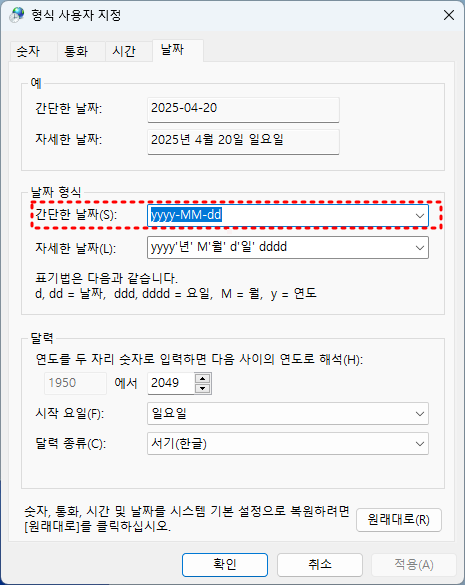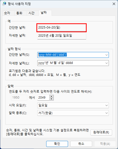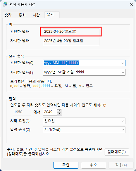 - 위 형식을 참고하여 원하는 스타일로 입력한 후 [적용] > [확인] 버튼을 누릅니다. ('ddd'는 요일 약어, 'dddd'는 요일 전체 이름)