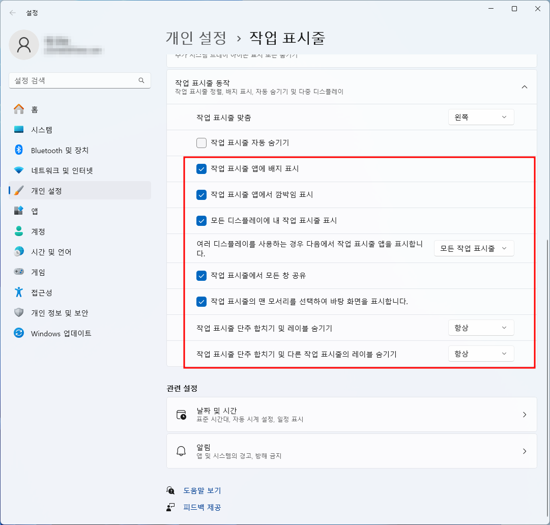 작업 표시줄 동작의 추가 설정 옵션 (선택 사항)