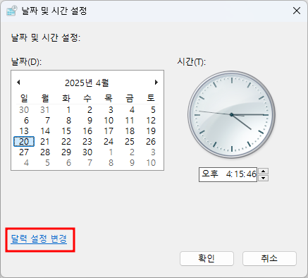 작업 표시줄 날짜/시간 영역 우클릭 > 날짜 및 시간 조정 선택