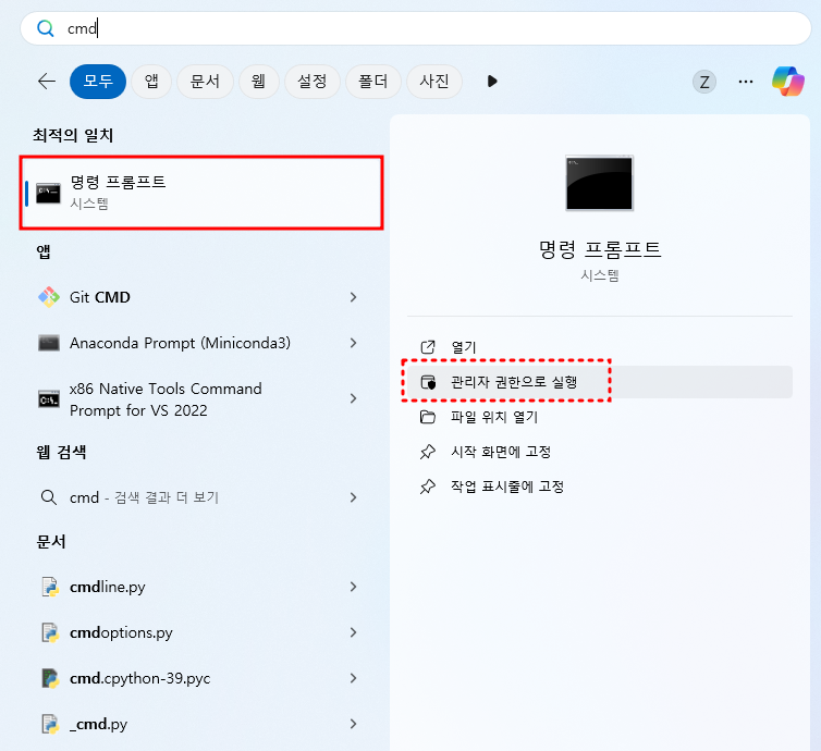 명령 프롬프트(CMD)를 관리자 권한으로 실행