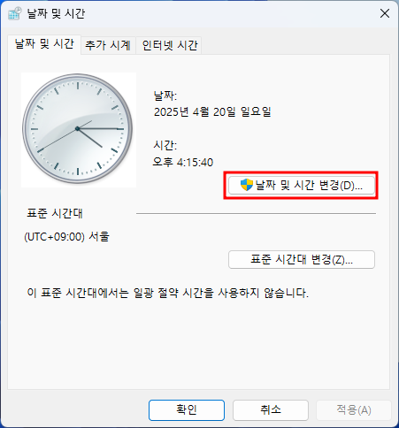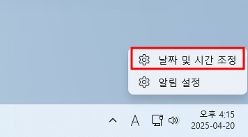 - 작업 표시줄 오른쪽 끝의 날짜 및 시간 영역을 마우스 오른쪽 버튼으로 클릭하고 [날짜 및 시간 조정]을 선택합니다. (또는 윈도우 설정 > 시간 및 언어 > 날짜 및 시간으로 이동)