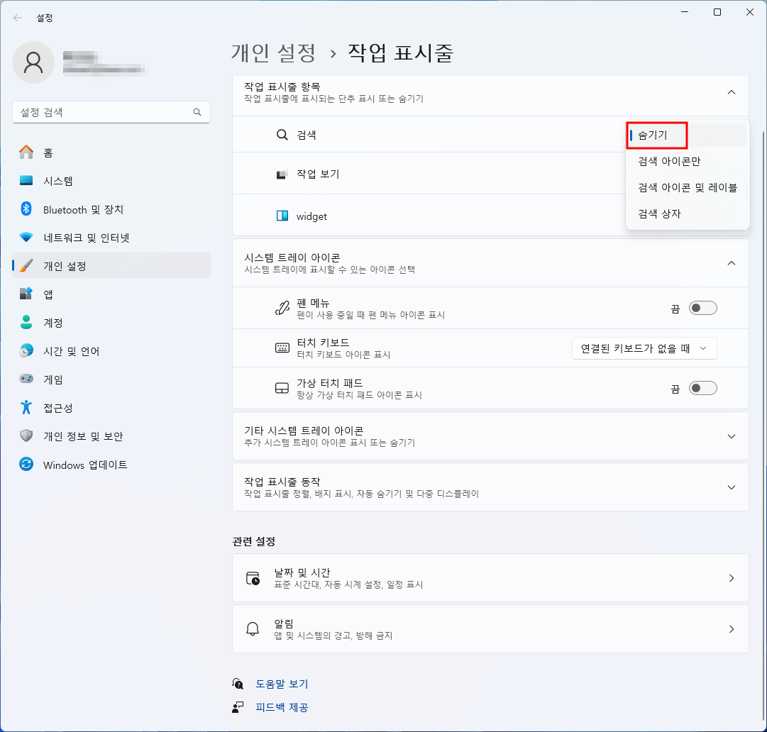 3. 바로 아래 '검색' 항목 옆의 드롭다운 메뉴를 클릭하여 '숨기기'를 선택합니다. (작업 표시줄의 돋보기 또는 검색 상자가 사라집니다.)