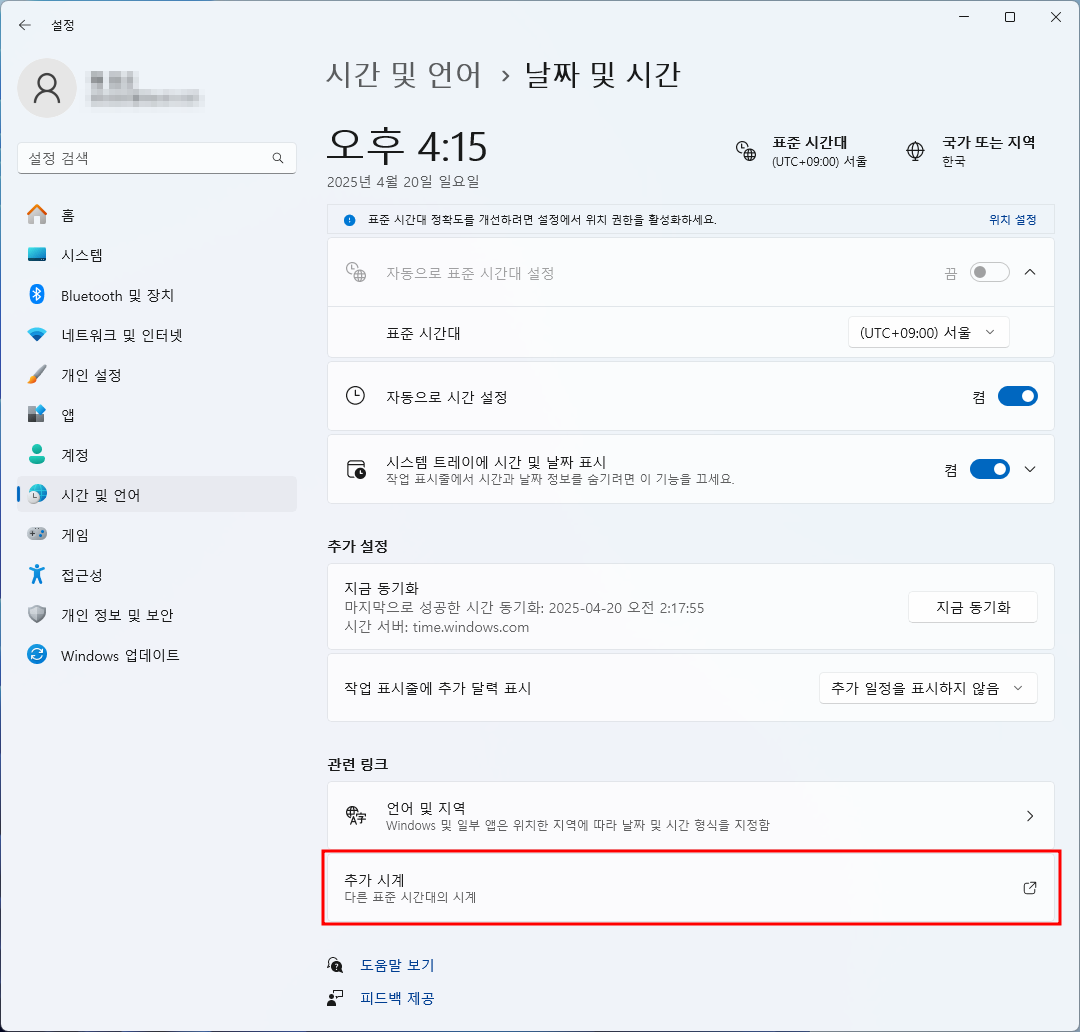 날짜 및 시간 설정 > 언어 및 지역 클릭 (또는 관련 설정의 '추가 시계')