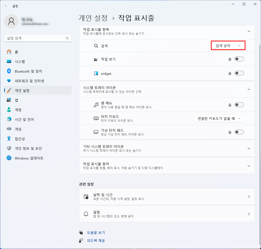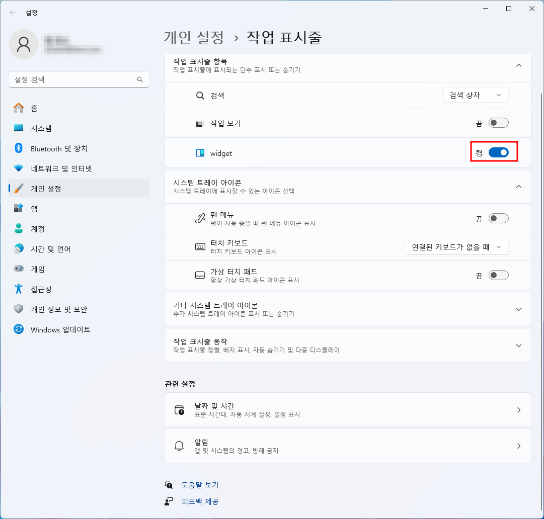 2. '작업 표시줄 항목' 섹션에서 '위젯' 옆의 스위치를 클릭하여 '켬'에서 '끔'으로 변경합니다. (작업 표시줄 왼쪽의 날씨 등이 사라집니다.)