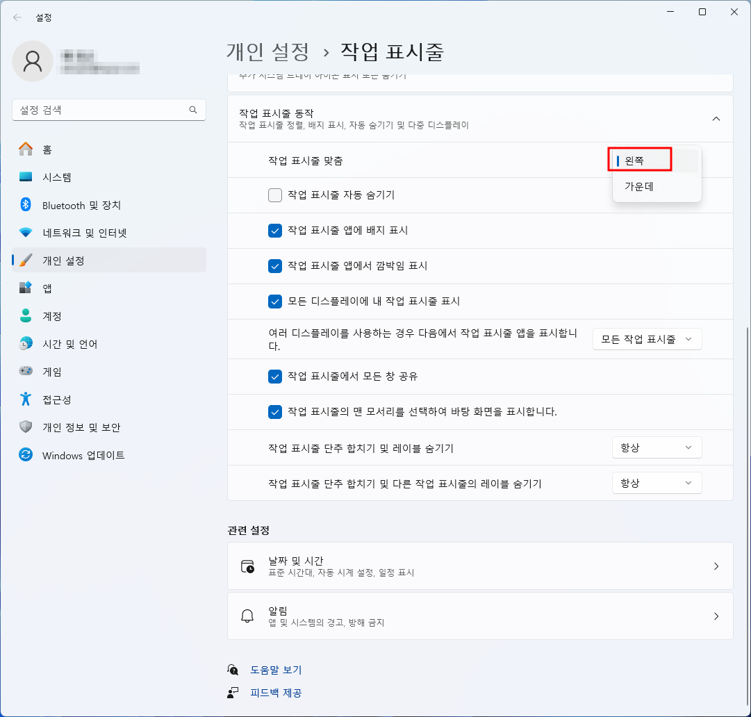4. 스크롤을 내려 [작업 표시줄 동작] 섹션을 펼칩니다. '작업 표시줄 맞춤' 옵션을 '가운데'에서 '왼쪽'으로 변경합니다. (시작 버튼과 아이콘들이 왼쪽으로 이동합니다.)