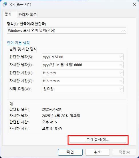 - '언어 및 지역' 설정에서 [지역 형식] 옆의 드롭다운 메뉴를 클릭하여 [형식 변경]을 선택합니다. 새로운 창이 뜨면 하단의 [추가 설정...] 버튼을 클릭하고, '형식 사용자 지정' 창에서 [날짜] 탭을 선택합니다.